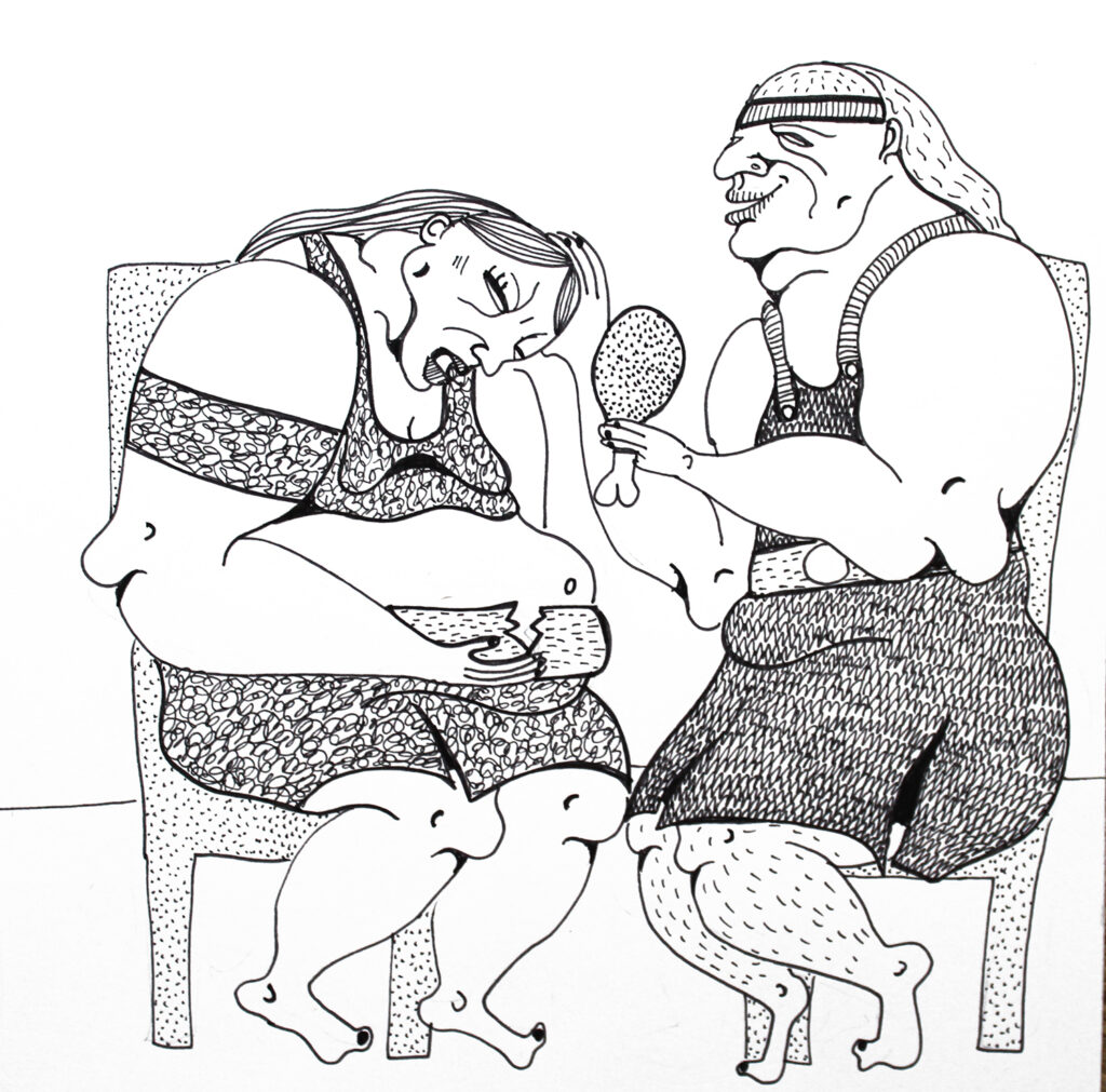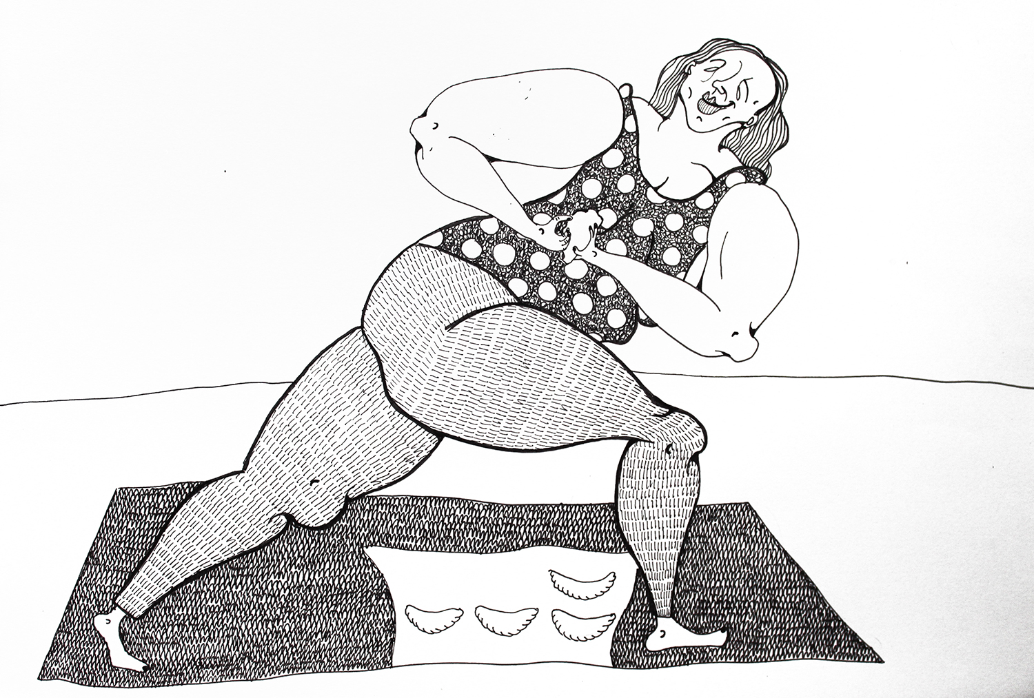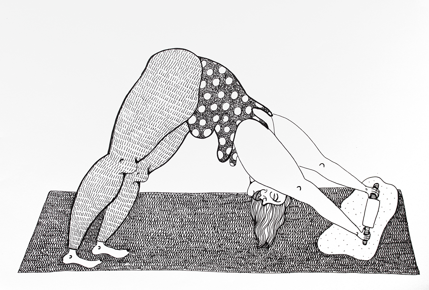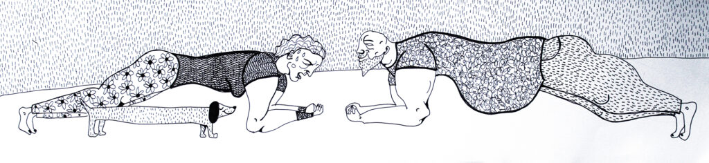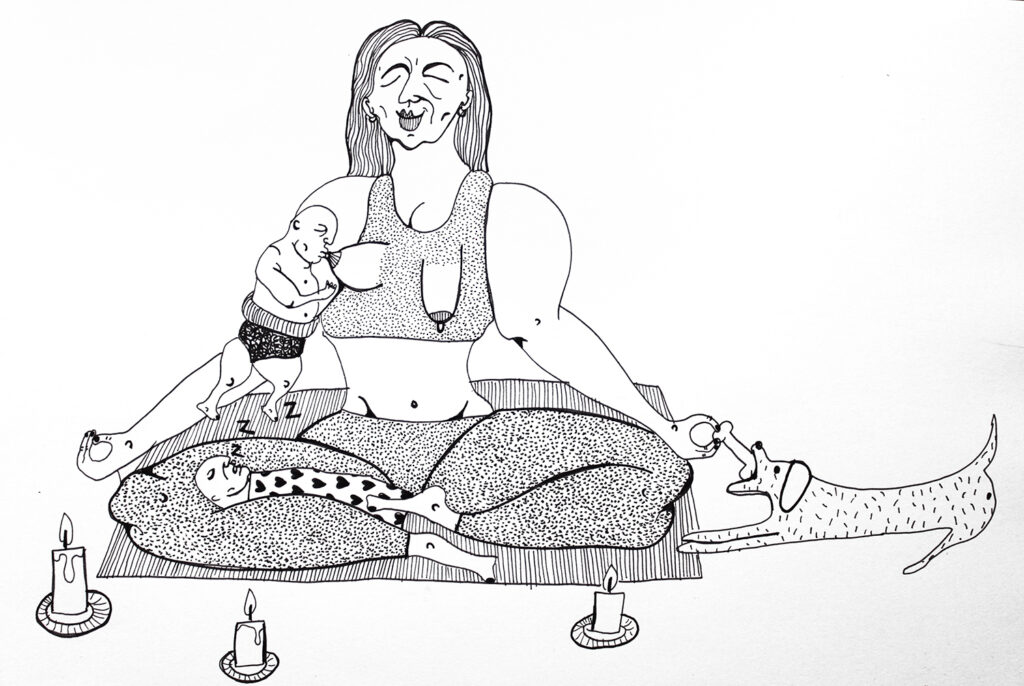 Grafiki Mireli Bukały mają wyraźną, satyryczną wymowę. Przedstawione na nich postaci są groteskowe, nieidealne, czasem celowo przerysowane. Taki język wizualny pozostaje w świadomej kontrze do dominujących dziś trendów, w których joga bywa prezentowana przez pryzmat perfekcyjnych sylwetek, estetycznej bezbłędności i „instagramowej” stylizacji.