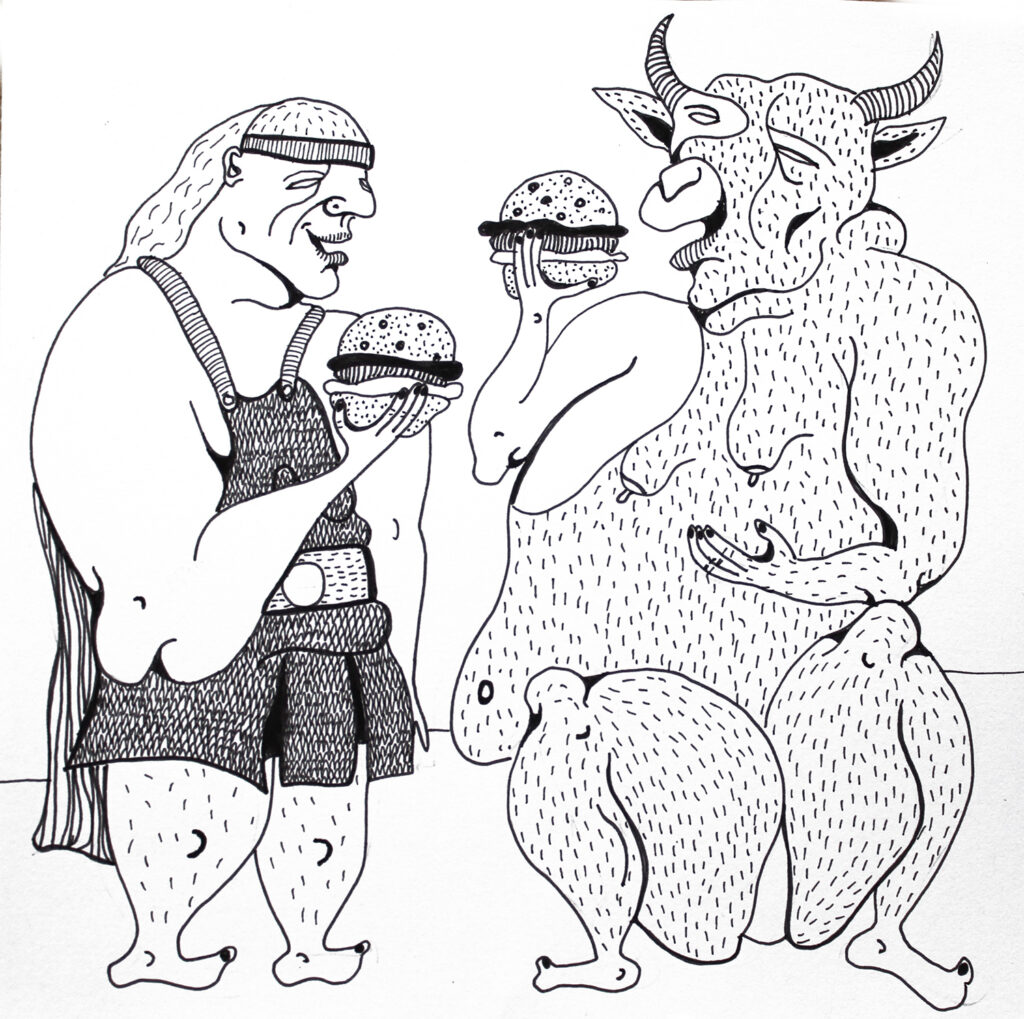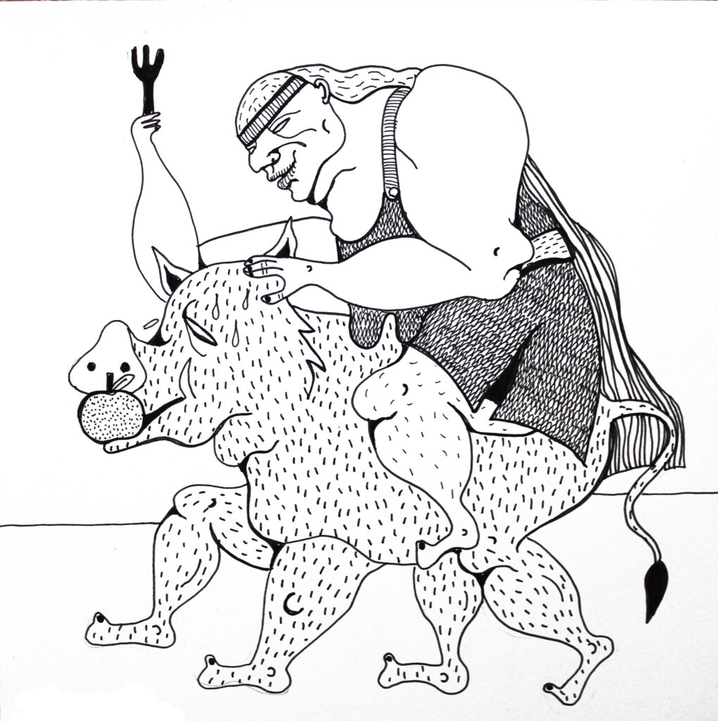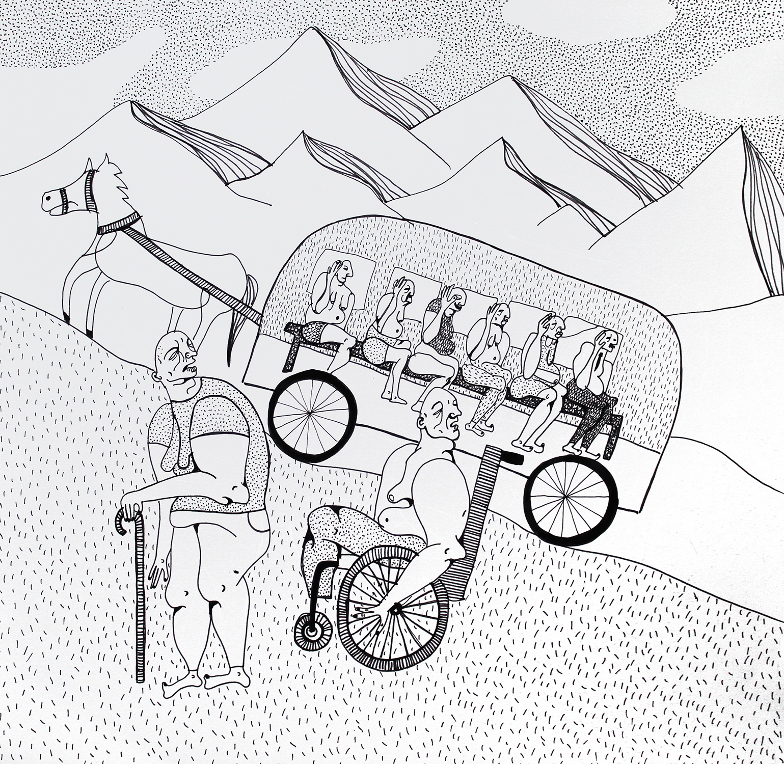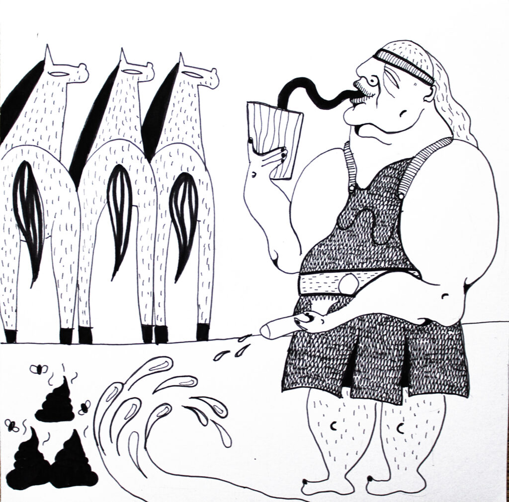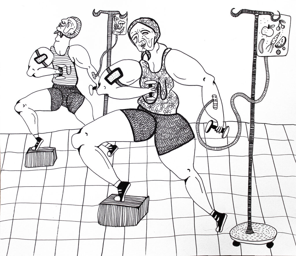 Grafiki Mireli Bukały mają wyraźną, satyryczną wymowę. Przedstawione na nich postaci są groteskowe, nieidealne, czasem celowo przerysowane. Taki język wizualny pozostaje w świadomej kontrze do dominujących dziś trendów, w których joga bywa prezentowana przez pryzmat perfekcyjnych sylwetek, estetycznej bezbłędności i „instagramowej” stylizacji.